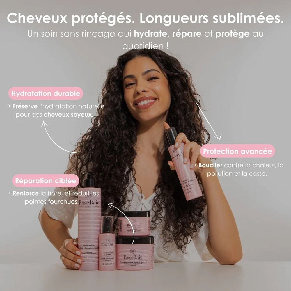 Parfum Figue Découvrez le Leave-In Thermoprotecteur Figue de Barbarie Rosebaie, un soin sans rinçage enrichi enhuile de figue de barbarieetkératinepour des cheveux hydratés, réparés et protégés. Hydratation intense: préserve l'hydratation naturelle pour des cheveux soyeux et faciles à coiffer. Protection thermique jusqu'à 210° Réparation ciblée: renforcer la fibre capillaire et réduire les pointes fourchues. Protection avancée: protège contre la chaleur, la pollution et prévient la casse. Sa formule légère, riche en vitaminesetoméga-6, revitalise vos cheveux sans les alourdir. Idéal pour tous types de cheveux, ce soin sublime leur éclat naturel dès la première application. Durée d'utilisation :2 mois |Contenance :150ml.