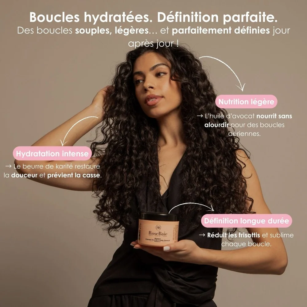 Apportez un soin profond à vos cheveux bouclés, frisés et crépus avec le masque Boucles Rosebaie, conçu pour hydrater et nourrir intensément, tout en définissant vos boucles.