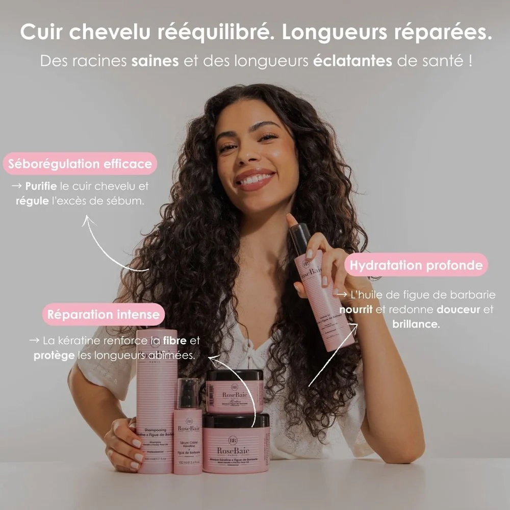 Parfum Figue Découvrez le Shampoing Figue de Barbarie Rosebaie, spécialement formulé pour une séborégulation, une réparation et une hydratation optimales. Enrichi en huile de figue de barbarie, ferment lactique postbiotique et en kératine, il offre un soin complet pour des cheveux nourris, renforcés et éclatants de santé. Séborégulation efficace : purifie le cuir chevelu, régule l’excès de sébum et apaise les irritations. Réparation intense : renforce la fibre capillaire, prévient la casse et protège les longueurs abîmées. Hydratation profonde : restaure la douceur et la brillance des cheveux secs et abîmés. Grâce à sa formule riche en vitamines et oméga-6, ce shampoing revitalise vos cheveux tout en sublimant leur éclat naturel. Idéal pour tous types de cheveux, il agit dès la première utilisation pour un cuir chevelu purifié et des longueurs visiblement réparées. Durée d’utilisation : 2 mois | Contenance : Shampoing 500ml
