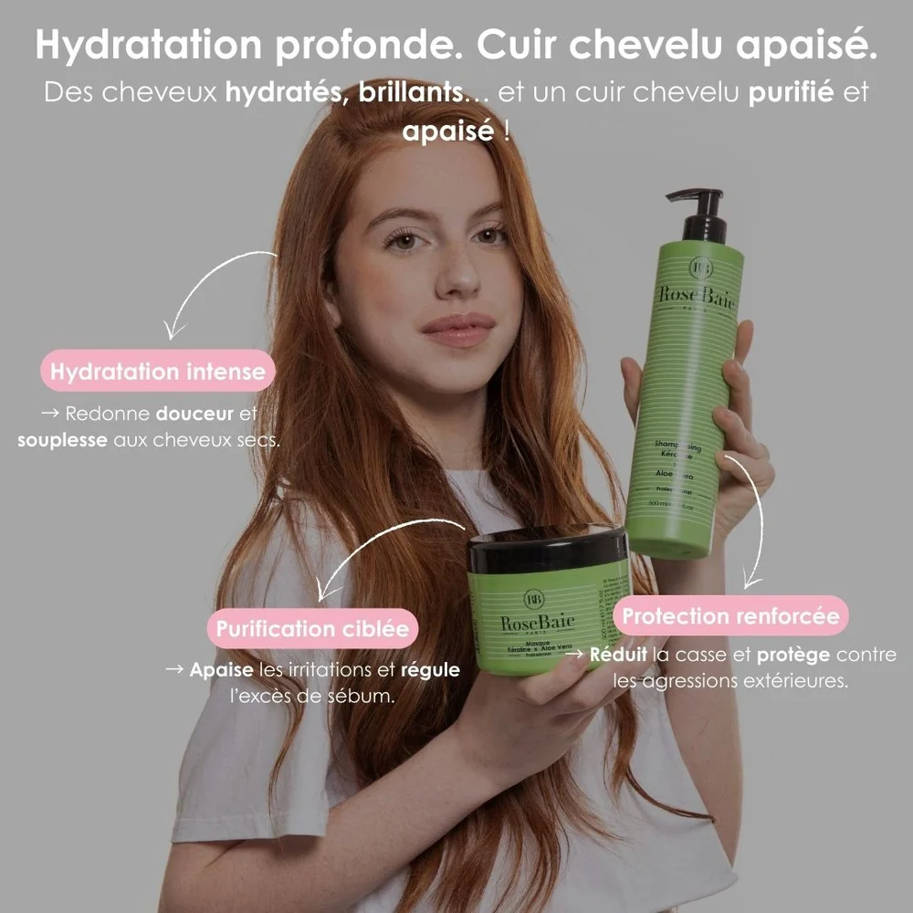 Sublimez vos cheveux avec le Sérum Aloe Vera Réparation & Hydratation Rosebaie, un soin sans rinçage conçu pour hydrater, renforcer sans irritation