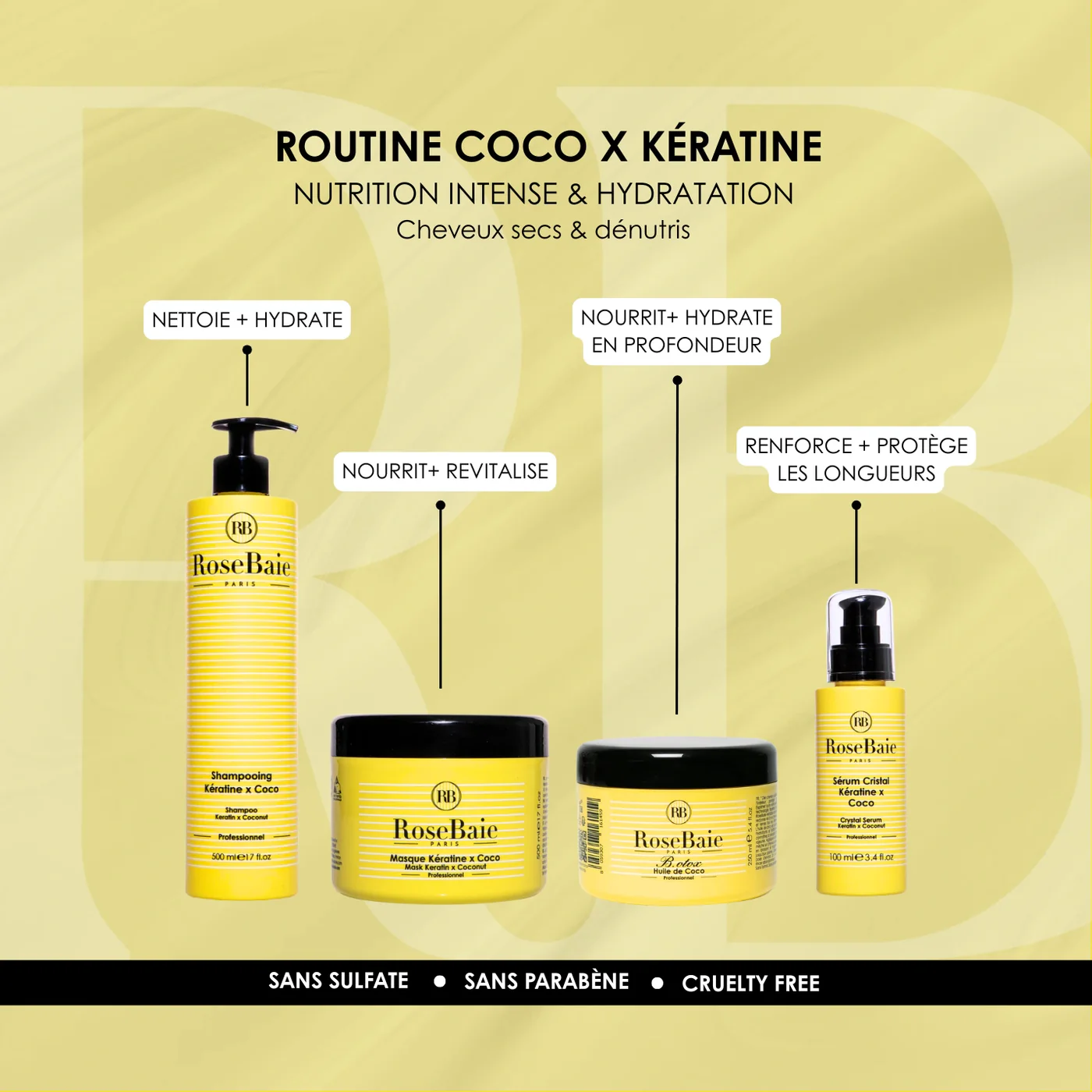 Découvrez le Sérum Coco Nutrition & Hydratation Rosebaie, un soin intensif enrichi enkératineethuile de coco, conçu pour nourrir, hydrater et protéger vos cheveux.